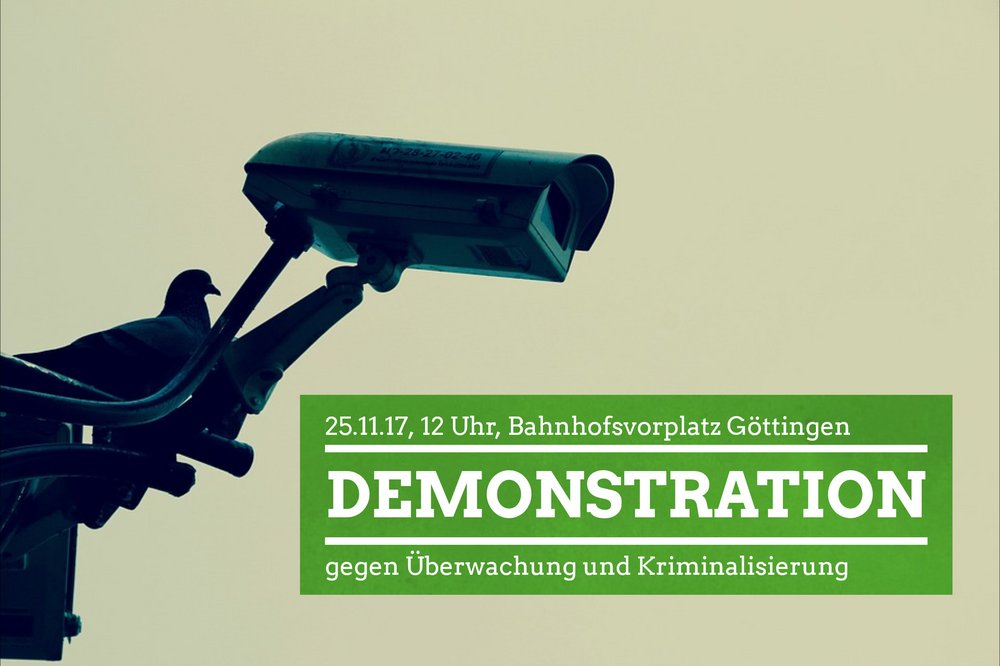Kommt am 25.11.2017 um 12 Uhr zum Bahnhofsvorplatz in Göttingen und demonstriert mit uns zusammen gegen Überwachung und Kriminalisierung und für ein Ende der Beobachtung von Bürgerinnen und Bürgern durch Polizei und Justiz!