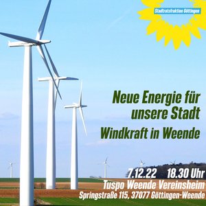 Am 7. Dezember haben wir als Grüne Stadtratsfraktion gemeinsam mit den Grünen im Ortsrat Weende zur Diskussion über Windkraftanlagen in Weende-Deppoldshausen eingeladen. Mit 120 Teilnehmenden, die Windkraft im Stadtgebiet überwiegend positiv gegenüberstehen, war die Veranstaltung unserer Ansicht nach ein voller Erfolg - zu dem auch die vorgetragenen Argumente der Anwohnenden von Weende-Deppoldshausen beigetragen haben.