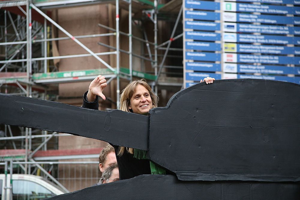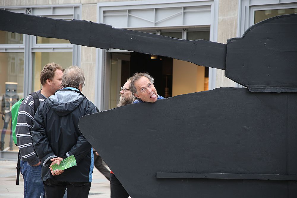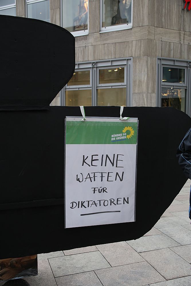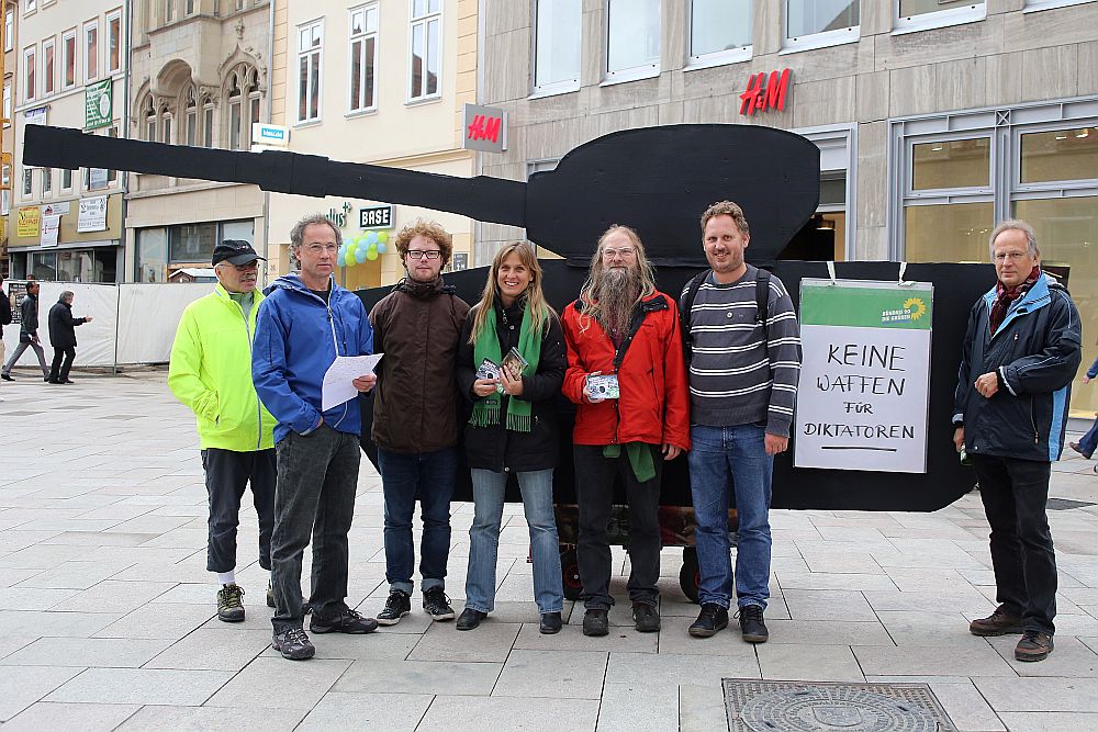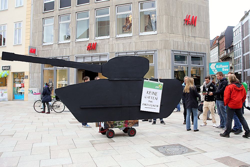 Es ist kurz vor drei und viele Menschen sind zum Einkaufen in die Fußgängerzone gekommen – doch etwas löst Verwunderung aus. Eine etwa fünf mal drei Meter große Panzersilhouette überragt alles in der Weenderstraße am Gänseliesel. Diese Szene konnten viele Passanten am vergangenen Mittwoch beobachten. Dabei handelte es sich um eine Aktion der Bundestagsabgeordneten und Rüstungsexpertin Katja Keul zusammen mit vielen Mitgliedern der Göttinger GRÜNEN. Sie wollten auf eine besorgniserregende Entwicklung aufmerksam machen. Denn unter Schwarz-Gelb hat sich der Wert der Waffenexporte verdoppelt, auch dank Rüstungsgeschäften mit Diktatoren, wie in Saudi-Arabien. Dass deutsche Panzer zum Beispiel zur Unterdrückung der Proteste in Bahrain im Einsatz waren, scheint niemanden in der Bundesregierung zu interessieren. „Auch der angebliche Widerstand von Außenminister Westerwelle gegen Pläne aus der CDU/CSU, die deutschen Richtlinien für Rüstungsexporte aufzuweichen, zeigt nur, wie blank die Nerven bei der FDP inzwischen liegen.“, so Keul. Im Bundestag seien es vor allem FDP-Abgeordnete gewesen, die sich gegen diese Richtlinien ausgesprochen hätten.