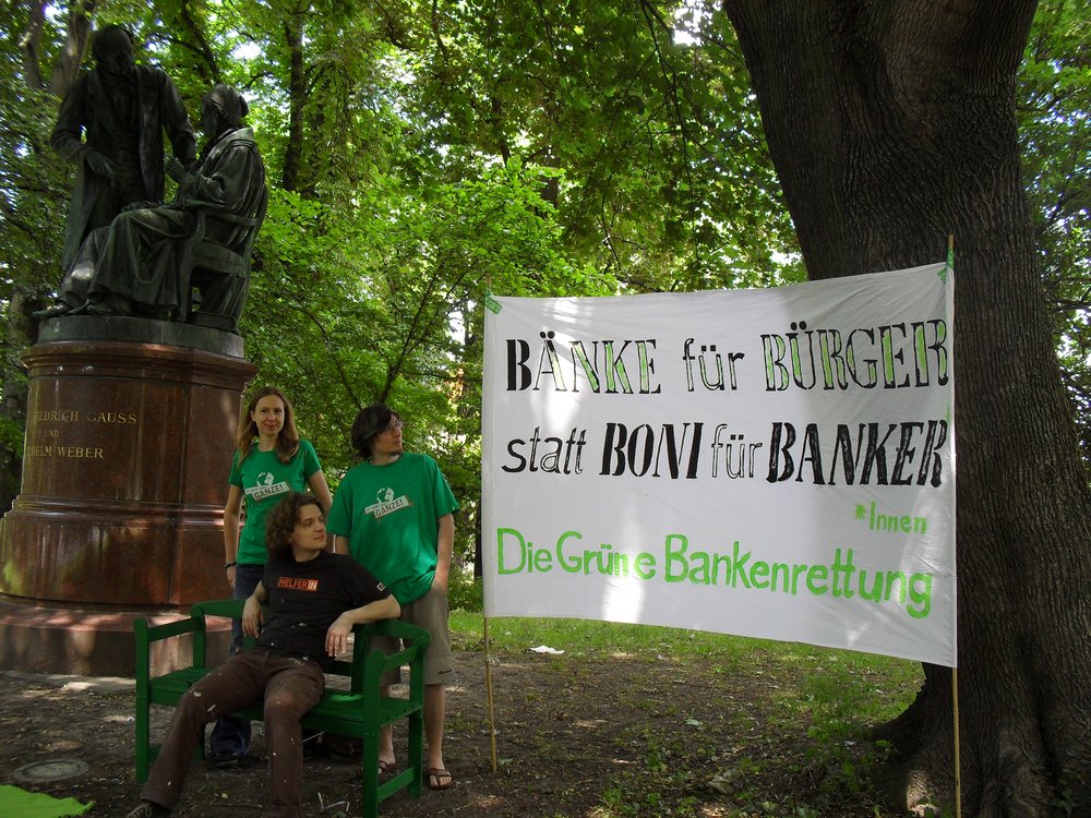 Am vergangenen Samstag wurde unter dem Gauß-Weber-Denkmal am Wall wieder eine Bank plaziert. Die GRÜNEN ersetzten mit einer grün angestrichenen Bank die zuvor entfernte Sitzgelegenheit - ein Eingriff in den öffentlichen Raum, der auf Kritik gestoßen war.