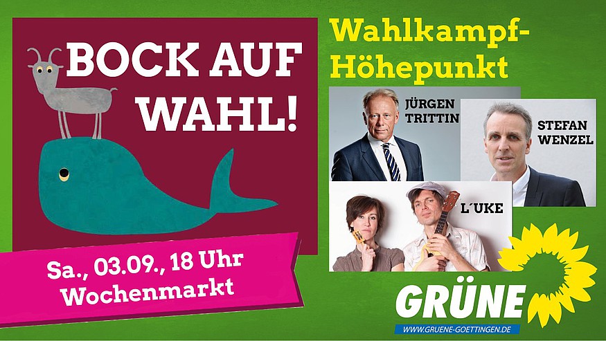 Besser zusammen - unter diesem Motto findet am kommenden Samstag, den 3.9., ab 18 Uhr unsere GRÜNE Wahlkampfhöhepunktveranstaltung auf dem Wochenmarkt statt. Unser GRÜNER Wahlkreisabgeordneter Jürgen Trittin sowie der niedersächsische Umweltminister Stefan Wenzel werden unsere Stadtratskandidat*innen auf der Bühne unterstützen. An verschiedenen Thementischen stehen die GRÜNEN Kandidat*innen den Bürgern Rede und Antwort, Kinder sind eingeladen, ihr Wunschbild von der Stadt zu malen, und das Ganze wird musikalisch begleitet von der Göttinger Band L'uke.