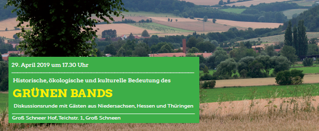 Der Kreisverband Göttingen und Ortsverband Friedland von BÜNDNIS 90/DIE GRÜNEN laden zur Diskussionsrunde „Historische, ökologische und kulturelle Bedeutung des Grünen Bands“ am Montag, 29. April 2019 ab 17.30 Uhr (bis 20:30 Uhr) in den Groß Schneer Hof (Teichstr. 1 in Groß Schneen) ein.