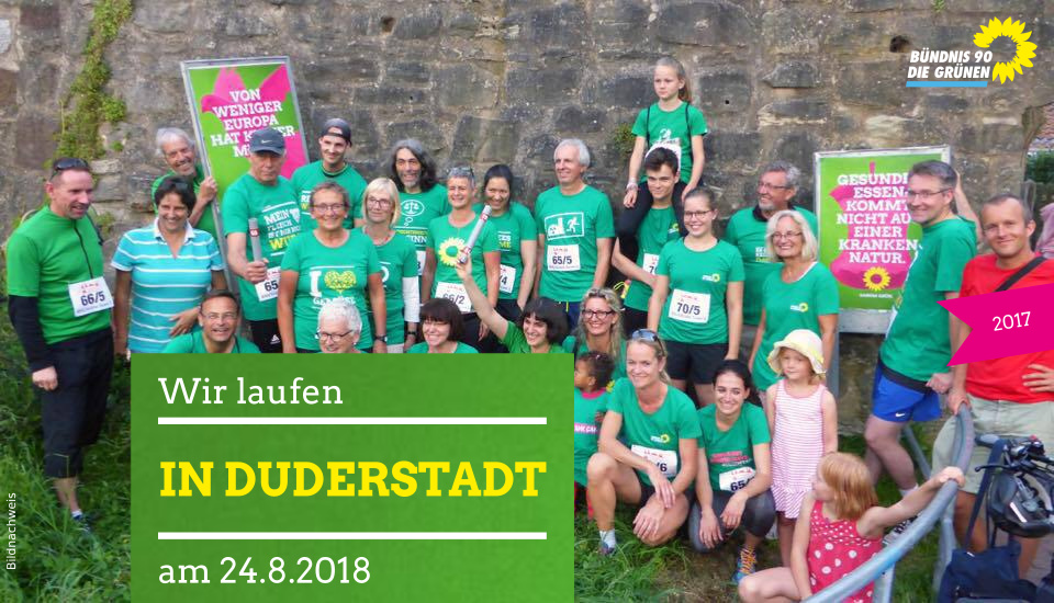 Wie bereits in den Vorjahren sind die Grünen aus Duderstadt und dem Landkreis beim Sparkassenlauf am 24.8. wieder mit am Start. Gemeldet wurden für den Lauf 2018 insgesamt 13 Läufer*innen, d.h. es werden 2 Staffeln mit jeweils 6 Läufer*innen sowie ein Einzelstarter über die 10 km für die Grünen an den Start gehen. „Die Stimmung in Duderstadts Altstadt ist einmalig, die Zuschauer in der Stadt einfach großartig, das Erlebnis wollen wir uns nicht entgehen lassen,“ so die Vorstandssprecherin Viola von Cramon von den Kreisgrünen.