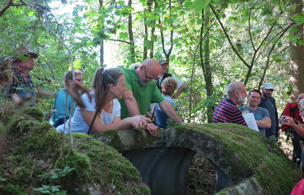 50 Interessierte folgten der Einladung und verfolgten die Spur der hochgiftigen Abwässer aus der Rüstungsproduktion im Werk Tanne in Clausthal. Startpunkt war das Munitionswerk, bei dem Knolle erklärte, dass 5,4 Millionen Kubikmeter der kritischen Abwässer über eine Reihe von Kaskaden in Richtung Osterode geleitet wurden. Entlang dieser Leitung kam es immer wieder zu Störungen, so dass die giftigen Schlämme unkontrolliert den Abhang herunter flossen. Belastungen finden sich auch noch in den zwei Absetzbecken im Bremketal und im Speicherbecken am Veilchenweg.