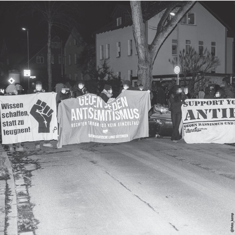 Bei den Demonstrationen tauchen momentan immer wieder antisemitische Flyer auf. Slogans wie „Impfen macht frei“ vergleichen die angebliche Diskriminierung Ungeimpfter mit den Opfern der Massenvernichtung des deutschen Faschismus und relativieren damit klar den Holocaust. Auch letzten Montag wurde die Haltung der Coronaleugner:innen durch Schilder mit der Aufschrift „Corona Diktatur“ deutlich. Im Schatten der Demonstration im Ostviertel marschierten zwei stadtbekannte Neonazis - Jens Wilke und Tobias Haupt - in der Innenstadt auf. [1]