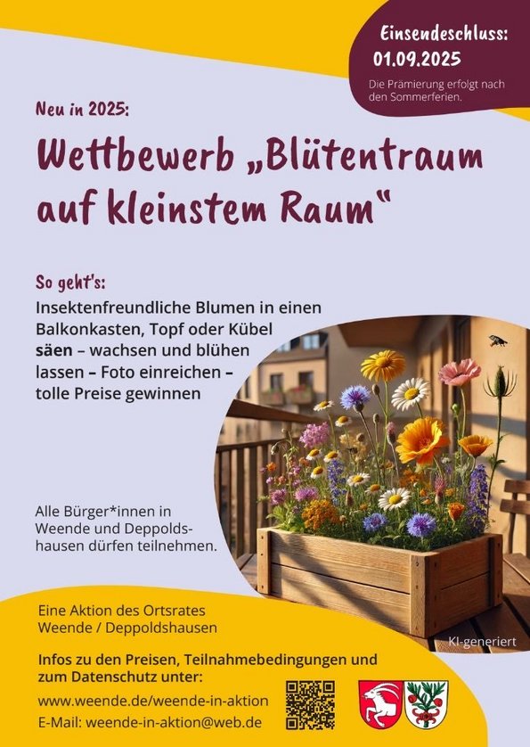 Für 2025 folgte der Ortsrat unserer Idenn den Wettbewerb auch 2025 durchzuführen. Damit auch Weender*innen ohne eigenen Garten etwas für die Diversität im Ortsteil tun können ist nun auch ein Wettbewerb für den Blumenkasten hinzugekommen.