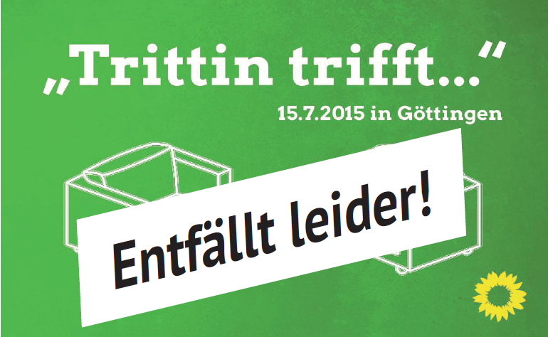 Vor kurzem haben wir an dieser Stelle auf unsere Veranstaltung aus der Reihe „Trittin trifft“ zum Thema Flüchtlinge am 15.7.2015 hingewiesen. Leider hat uns der Präsident des Bundesamtes für Migration und Flüchtlinge, Herr Dr. Manfred Schmidt kurzfristig absagen müssen. Wir haben uns deshalb entschieden, die Veranstaltung in Göttingen vorerst abzusagen und einen neuen Termin zu finden, um in gleicher, dann vollständiger Runde zu diskutieren.