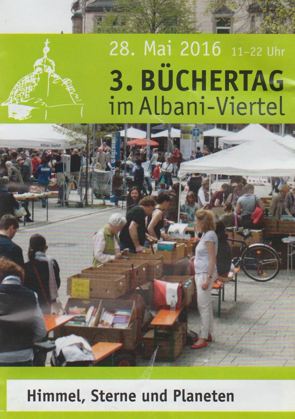 Am 28. Mai war der 3. Büchertag im Albani-Viertel. Bei strahlendem Sonnenschein gab es zahlreiche Bücherstände und Veranstaltungen. Das Oberthema war Himmel, Sterne und Planeten. Passend zum Thema hielt Hannes Hasselgruber im Grünen Zentrum einen Vortrag zu Jurij Gagarin. Vor dem Zentrum gab es noch einen Büchertisch. Die eingegangenen Spenden werden dem wohltätigen Straßenmagazin „Tagessatz“ übergeben. Die Stimmung auf dem Büchertag war durchgehend gut und wurde nebenbei von der Jazzband des Max-Planck-Gymnasium, etwas unterhalb des Grünen Zentrums, begleitet. Auch wer den Büchertag verpasst hat, hat die Möglichkeit ins Grüne Zentrum zu kommen, um den offenen Bücherschrank zu nutzen. Man kann sich immer ein Buch mitnehmen und gerne irgendwann auch ein Gutes mitbringen.
