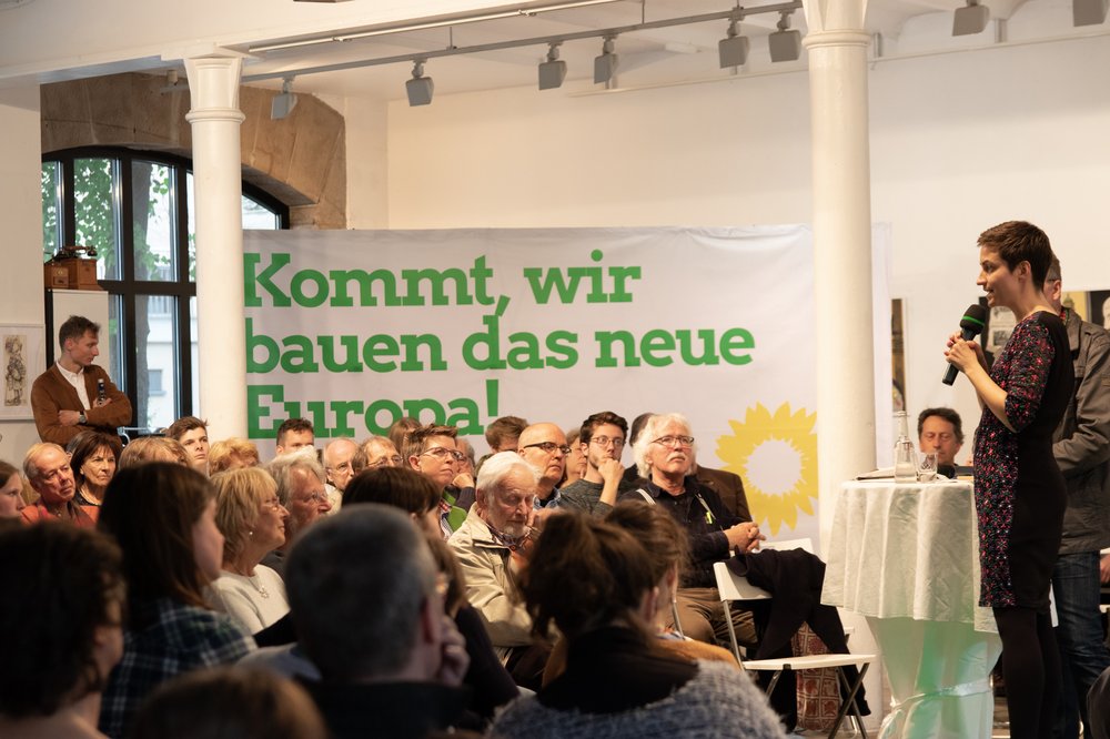 Bevor dann Fragen gestellt wurden, erzählte die grüne Spitzenkandidatin grob erst einmal über Vorteile, aber auch über Defizite der EU und Veränderungen, die in der Zukunft nötig sein werden. Dann folgt die Flut an Fragen, die sie versuchte alle so detailliert wie möglich zu beantworten. Es ist gleichermaßen interessant, wie bewunderswert, ihr zu zuhören, da sie auf scheinbar jede Frage mit dem Thema Europa eine umfangreiche Antwort weiß. Schön zu sehen war, wie die Zuhörerschaft den Abend aktiv mitgestalten wollte, indem sie zahlreiche wirklich fundierte Fragen stellte, die den Ablauf des Abends, erst möglich machte. Der Inhalt der Fragen reichte von der Klima – und Flüchtlingsfrage hin bis zur Idee eines Gesamteuropäischen Kanals. Konkrete Aussagen von ihr waren z.B.: